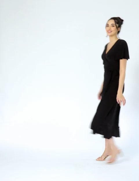 Letisha is a timeless true wrap dress crafted from our soft Signature Stretch Jersey. Featuring flared butterfly sleeves, subtle piping detail and a longer wrap skirt finished with a deep flared frill, it’s a beautifully flattering black dress you’ll wear on repeat.