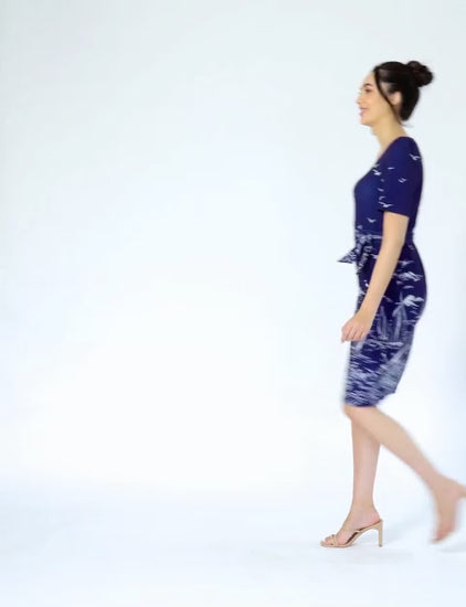 Finished with a self-tie sash that can be worn to define the waist or removed for a relaxed look, Julie is a versatile wardrobe staple in classic navy and ivory nautical sketch.