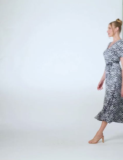 The Cristalle Dress in Alhambra — a timeless maxi silhouette with soft structure, side pockets and a contrast tie belt. Featuring our 1960s London-designed print with Spanish overtones, set on navy with ivory motifs.