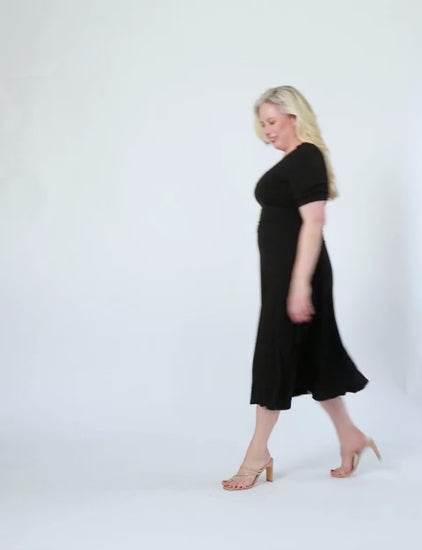 Elegant and effortless, the Silvana Dress is a modern take on the little black dress. Featuring a fit-and-flare silhouette with diamond-shaped panelling through the waist, underbust gathers, and a softly flared skirt. Finished with puff sleeves gathered into stretch cuffs for a feminine touch. Crafted in our signature jersey for comfort and movement.