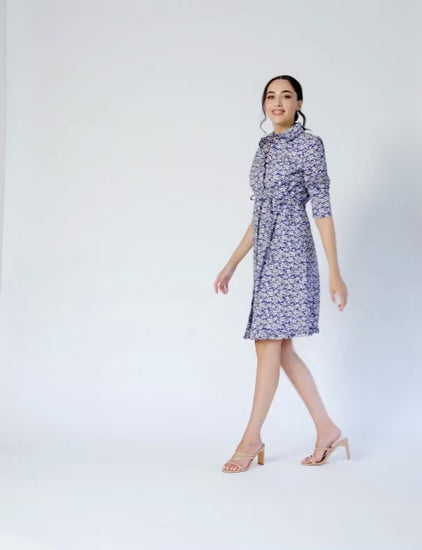 Diane is a timeless straight shirtdress in our elegant Fleurs Marine print, featuring soft parchment florals on a rich slate blue base.